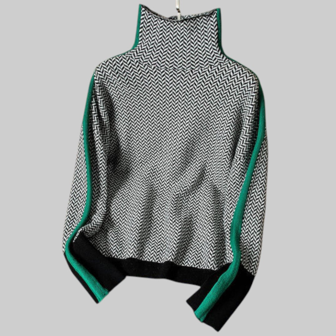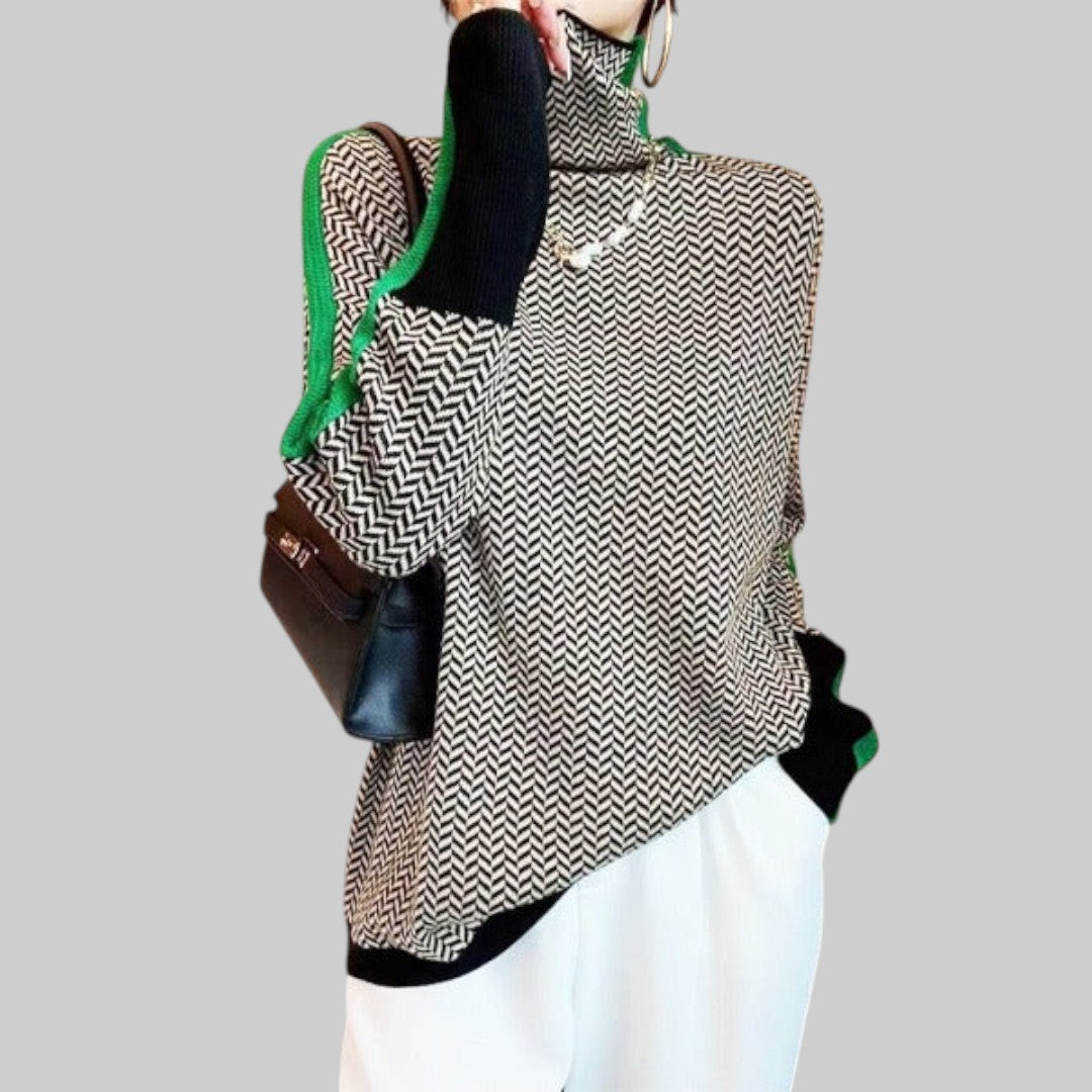 Елена – Стилен пуловер с висока яка и контрастни полоси