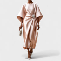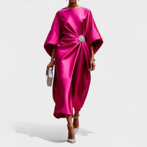 Открийте дългата вечерна рокля с уникален скулптурен силует и лъскав сатенен блясък. С асиметричното драпиране и елегантната закопчалка, тази рокля създава зашеметяващ ефект на талия, докато широките ръкави и плавното падане на тъканта осигуряват грациозно движение.