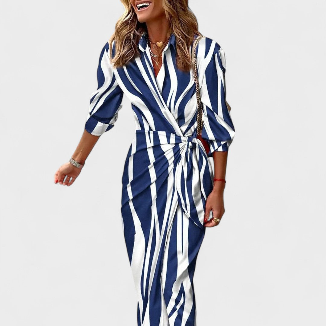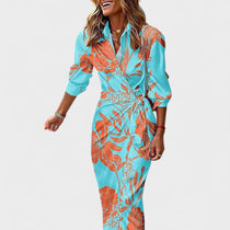 Открийте своя нов любим тоалет с нашата дълга рокля! Тази рокля с риза-крой и елегантна яка е изработена от лека и податлива тъкан, която красиво пада и създава флуиден силует. Перфектна за всякакви поводи, тя дискретно подчертава талията и осигурява свобода на движението, което я прави идеален избор както за ежедневни комбинации, така и за вечерни излизания.