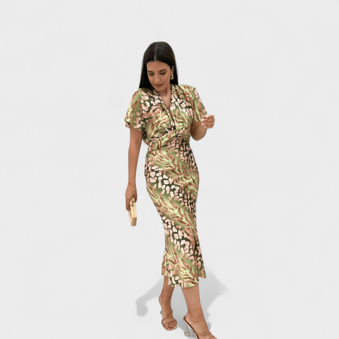 - Подчертава фигурата: Драпираното деколте, акцентираното на талията и миди дължината визуално удължават линията на тялото.