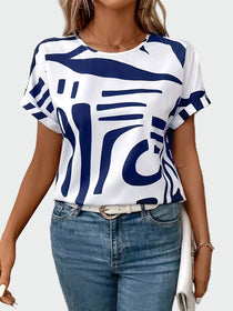 Открийте перфектната тениска за Вашия ежедневен стил! Тази тениска с къс ръкав в бяло, украсена с интензивни сини абстрактни геометрични шарки, е идеалният избор за модерни и свежи комбинации.