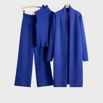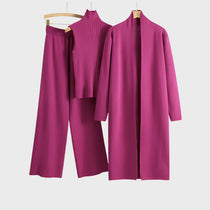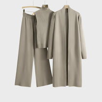 Открийте безпроблемна изтънченост с нашия трикомпонентен плетен комплект. Изработен от висококачествени, меки на допир материи, комплектът включва елегантен плетен топ, панталон със свободна кройка и съответстващ плетен кардиган. Идеален за релакс у дома или за специални поводи, този универсален комплект предлага безупречна комбинация от комфорт и елегантност.