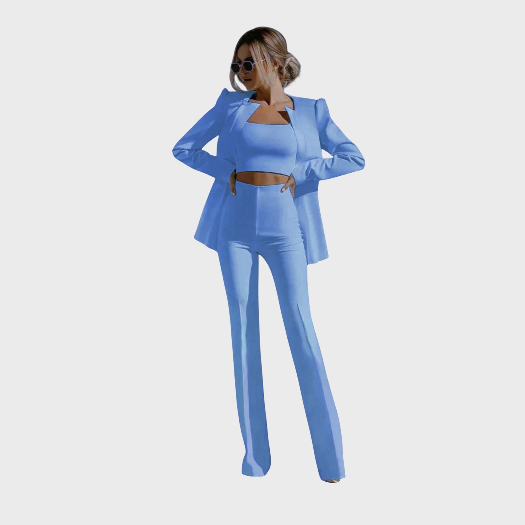 Открийте елегантния комплект Núria! Този стилен комплект от три части включва модерен блейзър, елегантен топ и удобни панталони – идеалният избор за всеки повод. Независимо дали става въпрос за офис среща или романтична вечеря, комплектът Núria съчетава максимален комфорт с уникален стил!