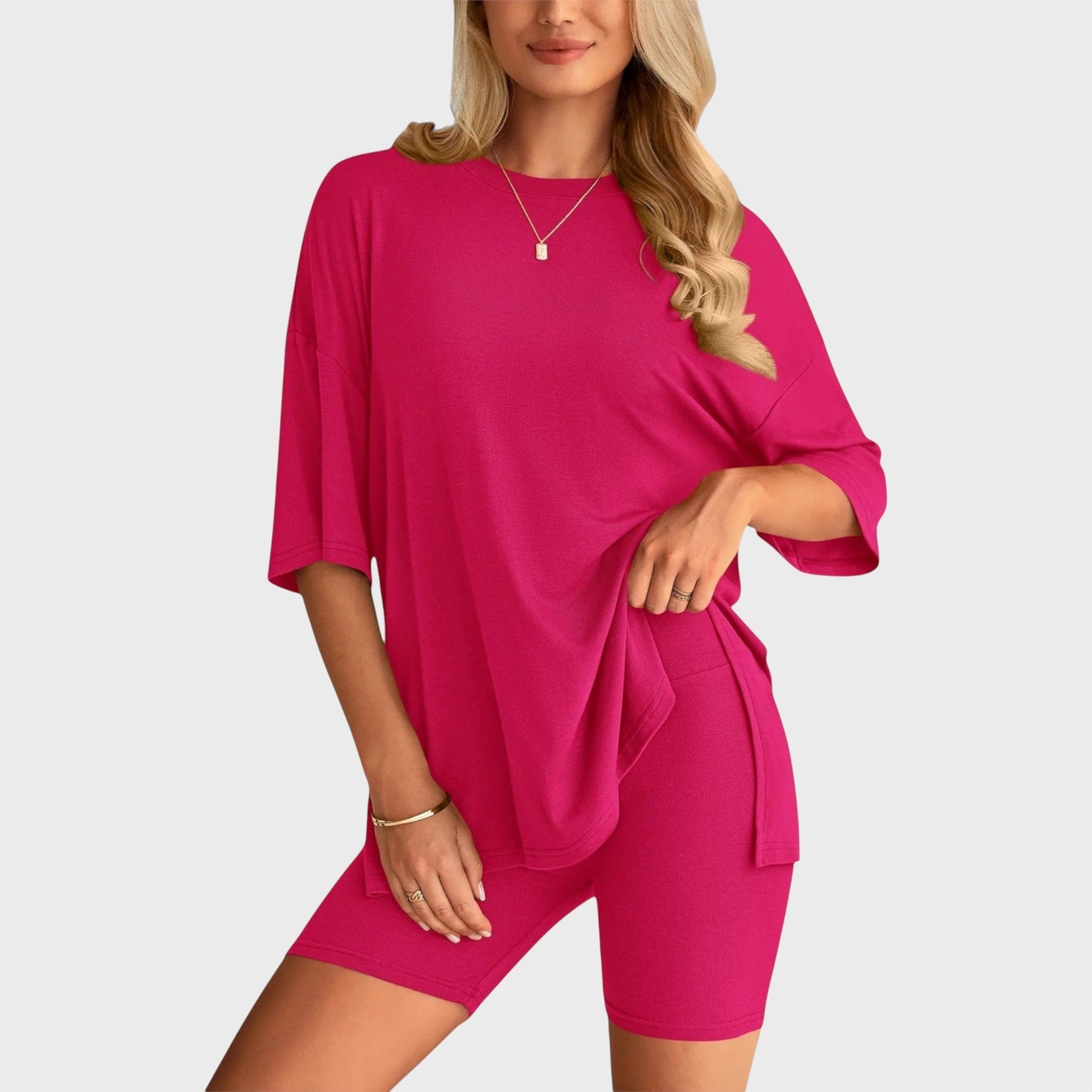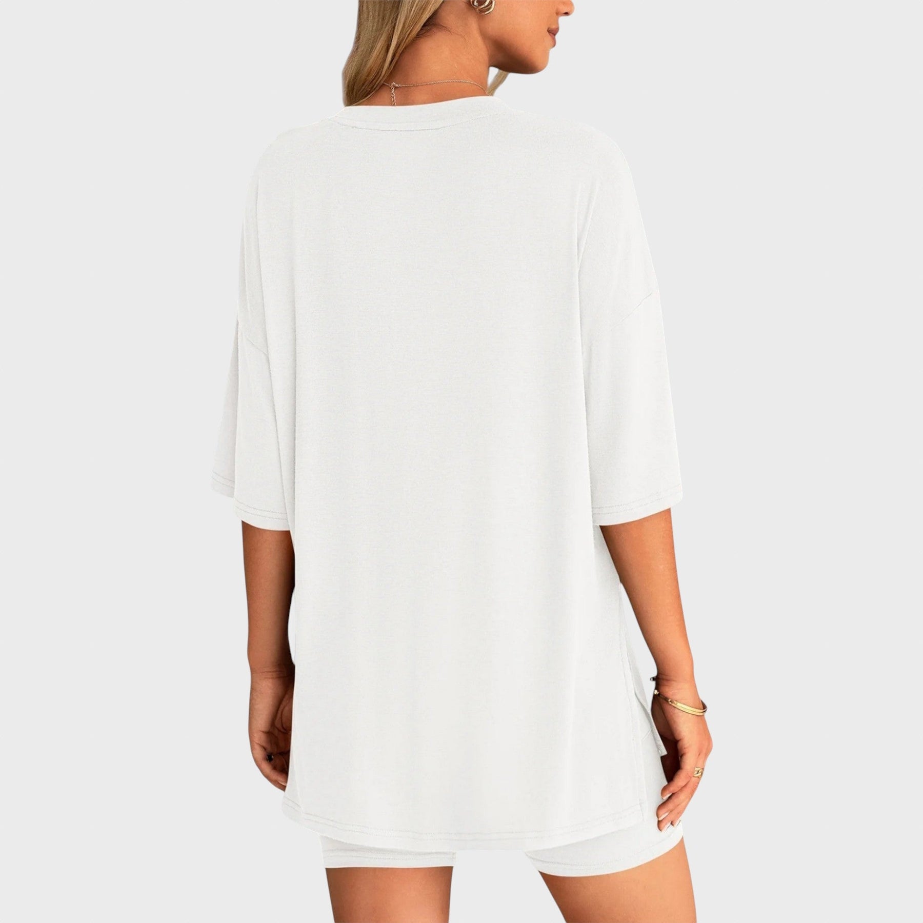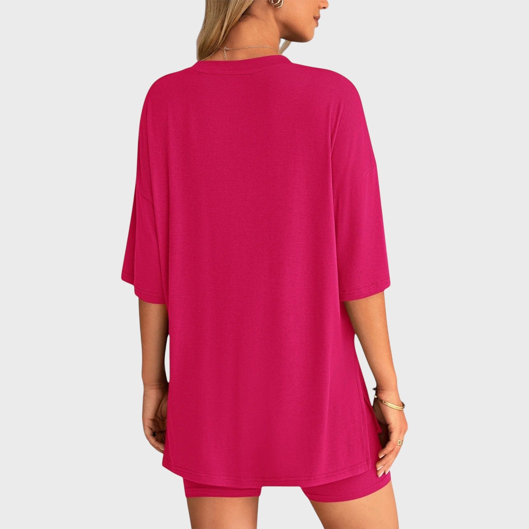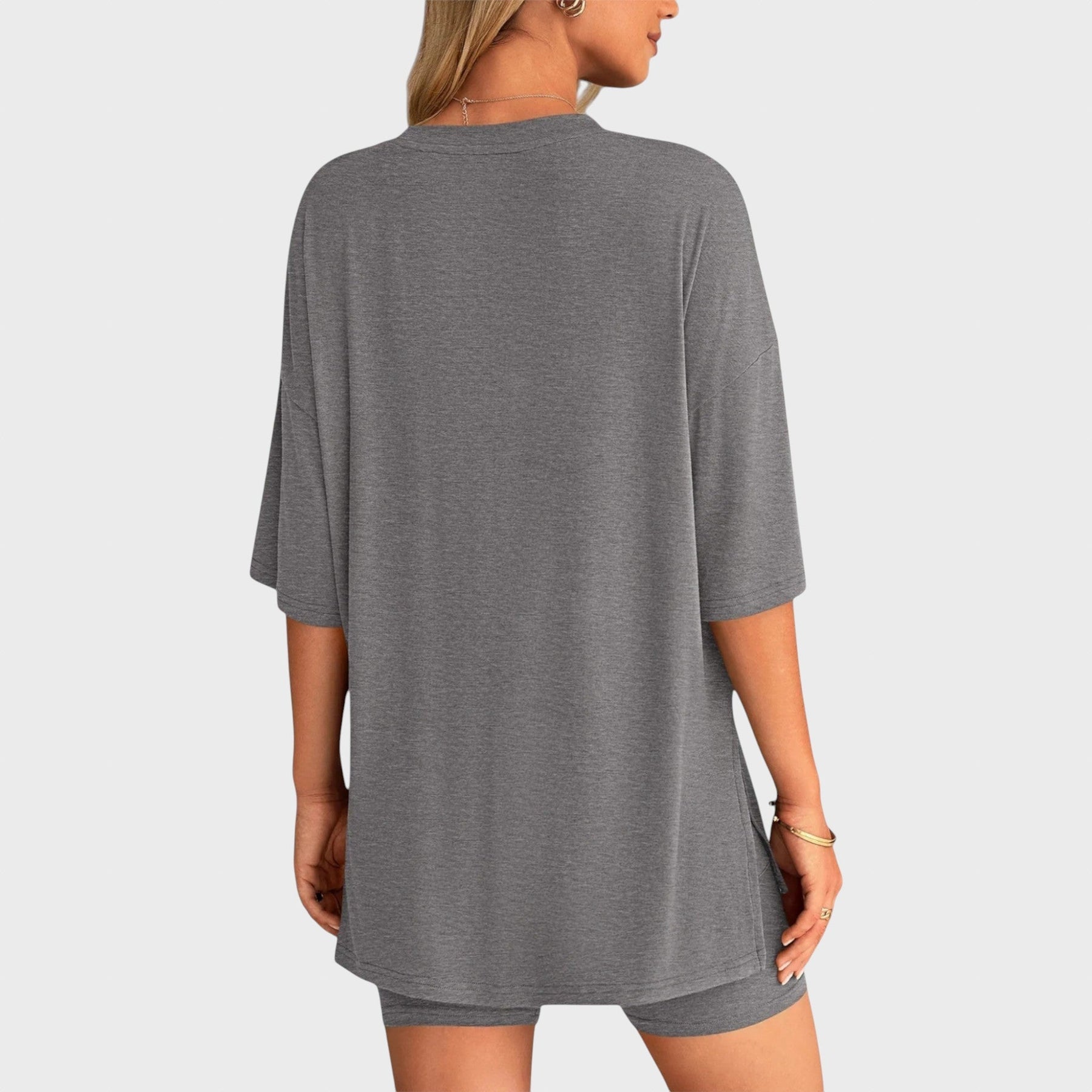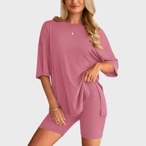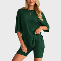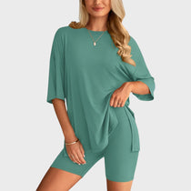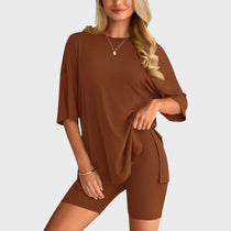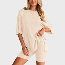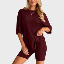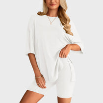 • Несравним комфорт: Свободната тениска и шортите с висока талия осигуряват удобно прилягане и неограничена свобода на движение, идеални за всяка дейност.