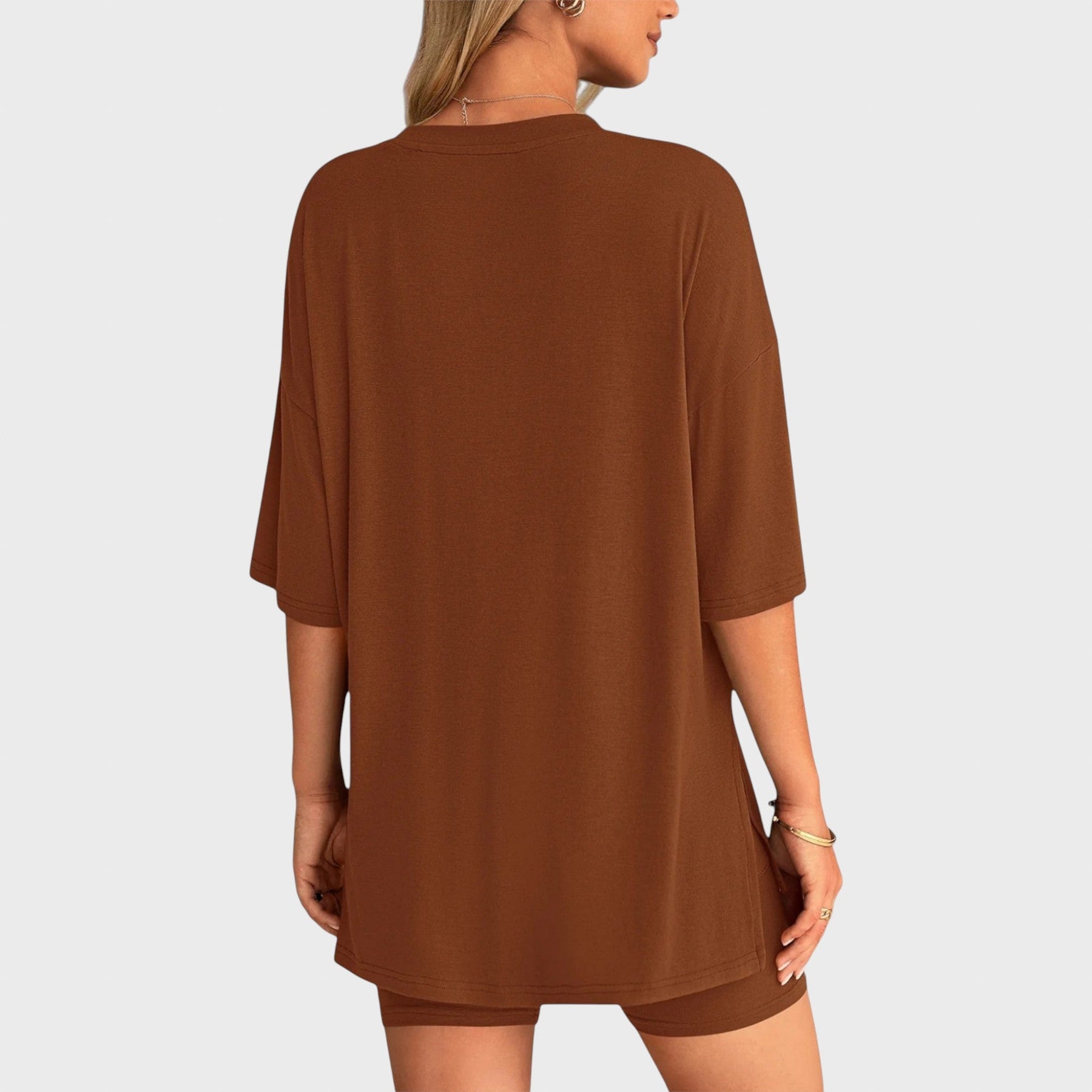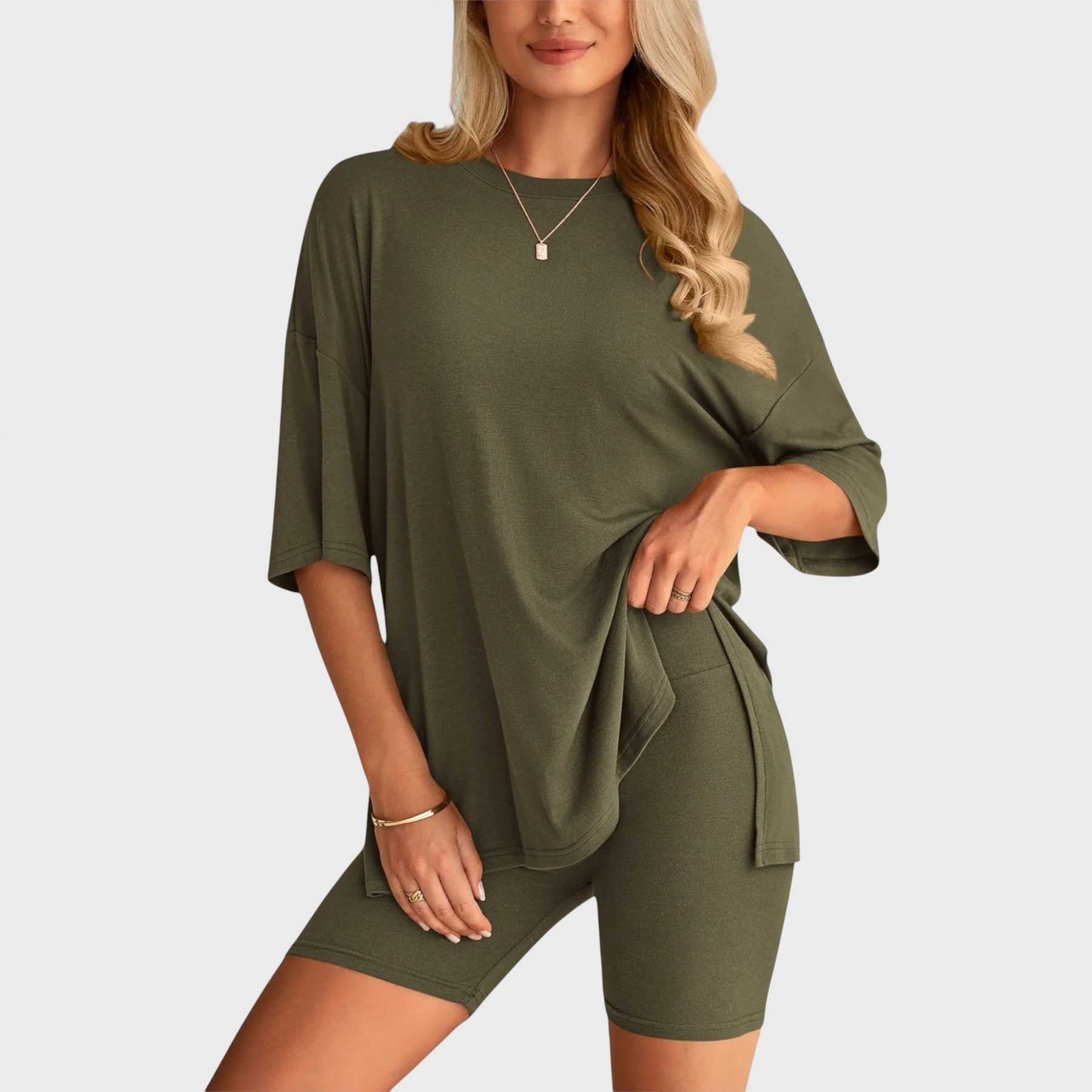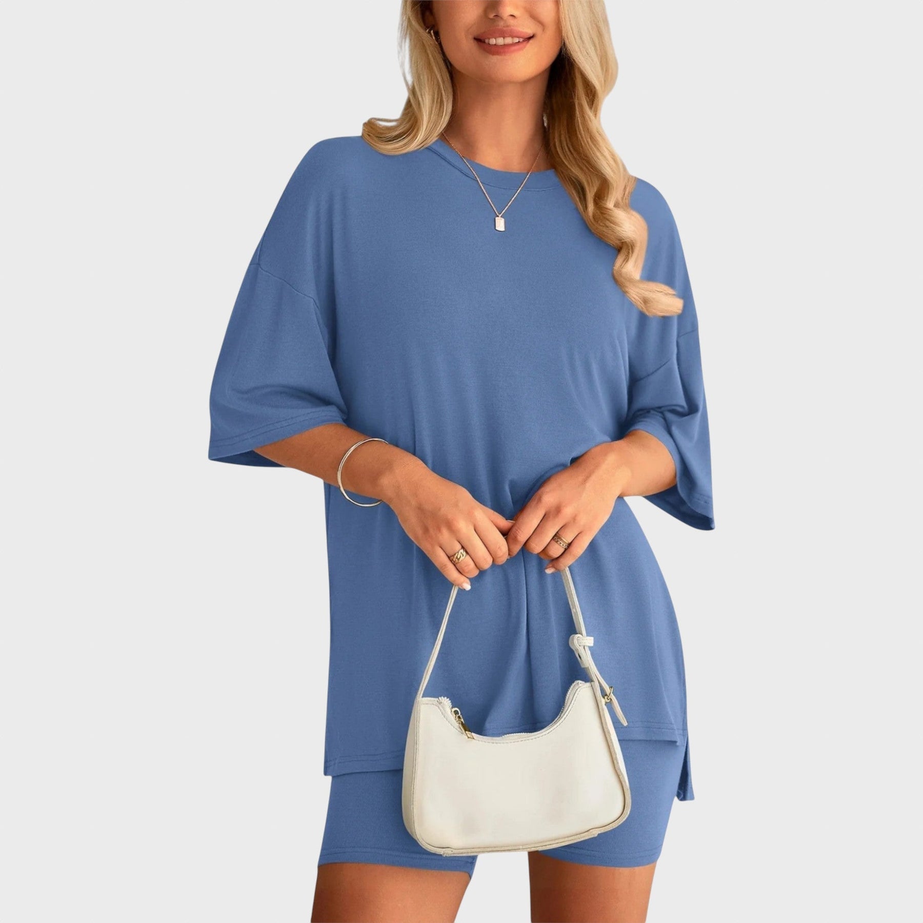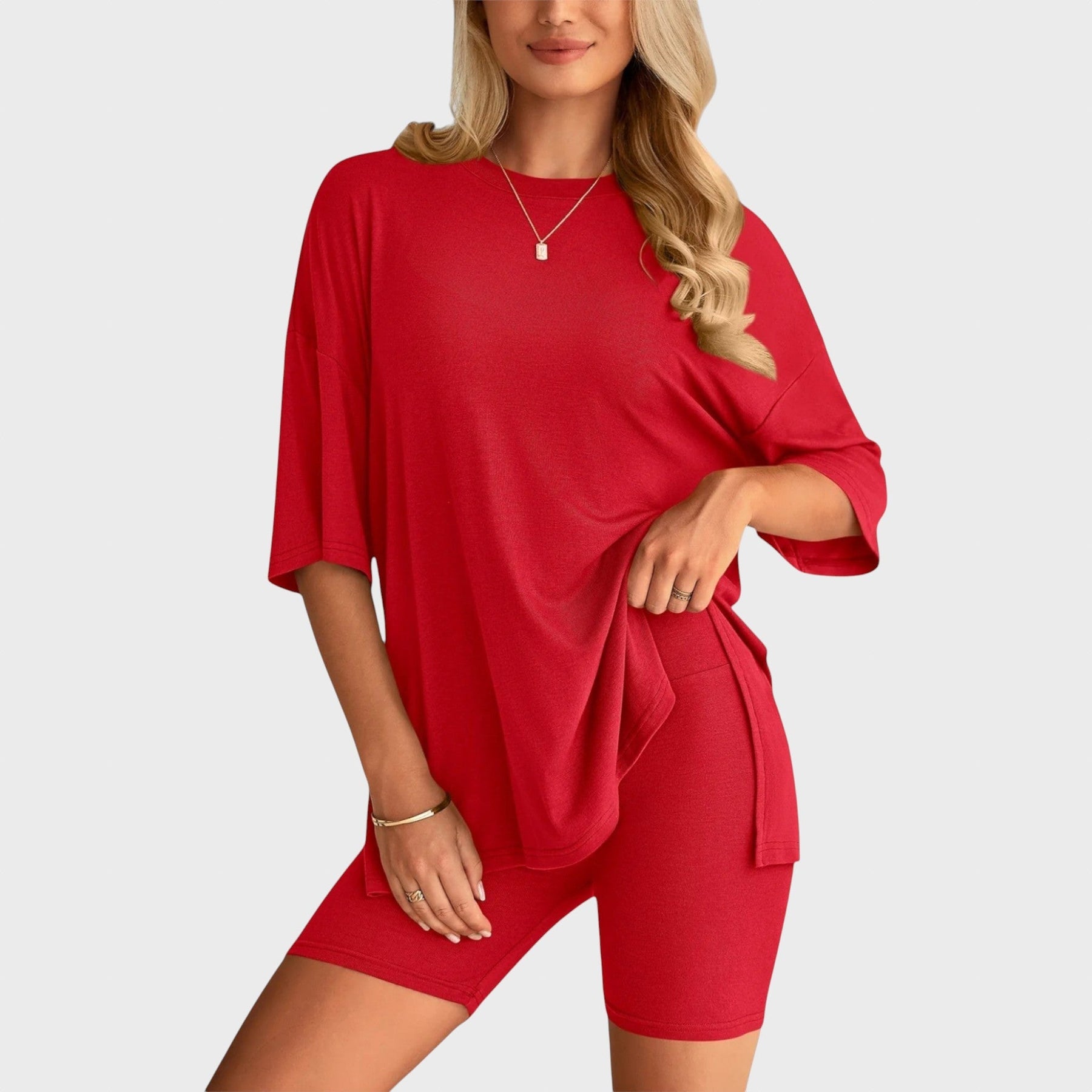 • Несравним комфорт: Свободната тениска и шортите с висока талия осигуряват удобно прилягане и неограничена свобода на движение, идеални за всяка дейност.