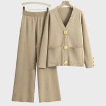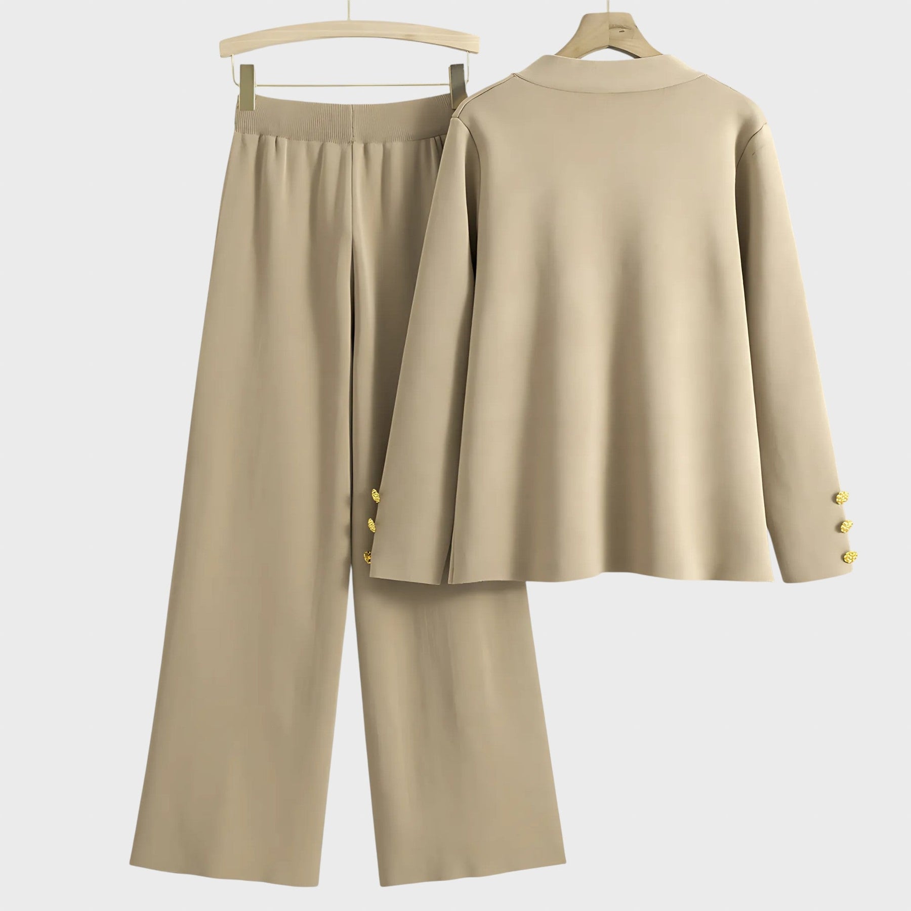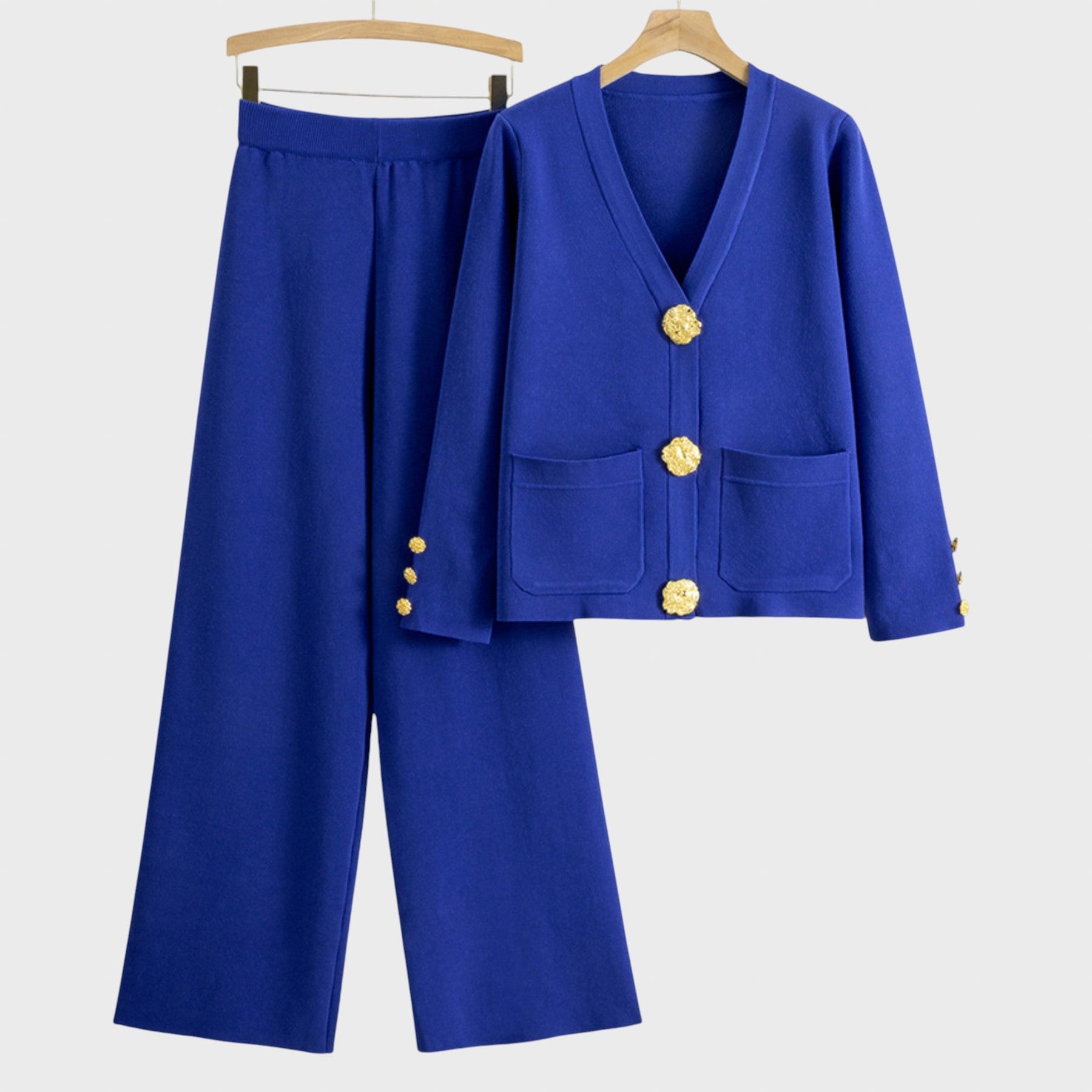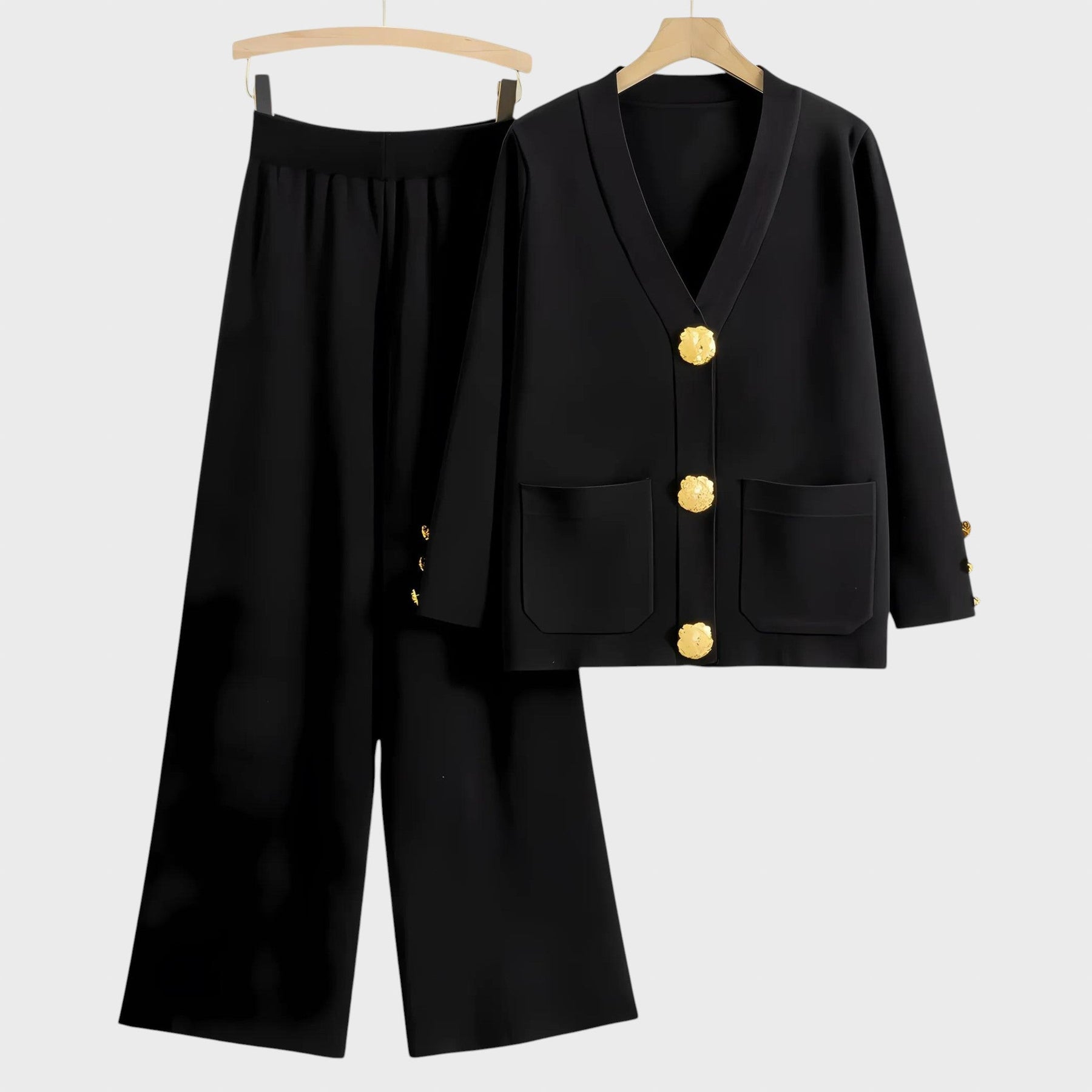 • Стил и комфорт: Жилетка с V-образно деколте и широки плетени панталони, които предлагат максимален комфорт и свобода на движение, без да жертвате елегантността.