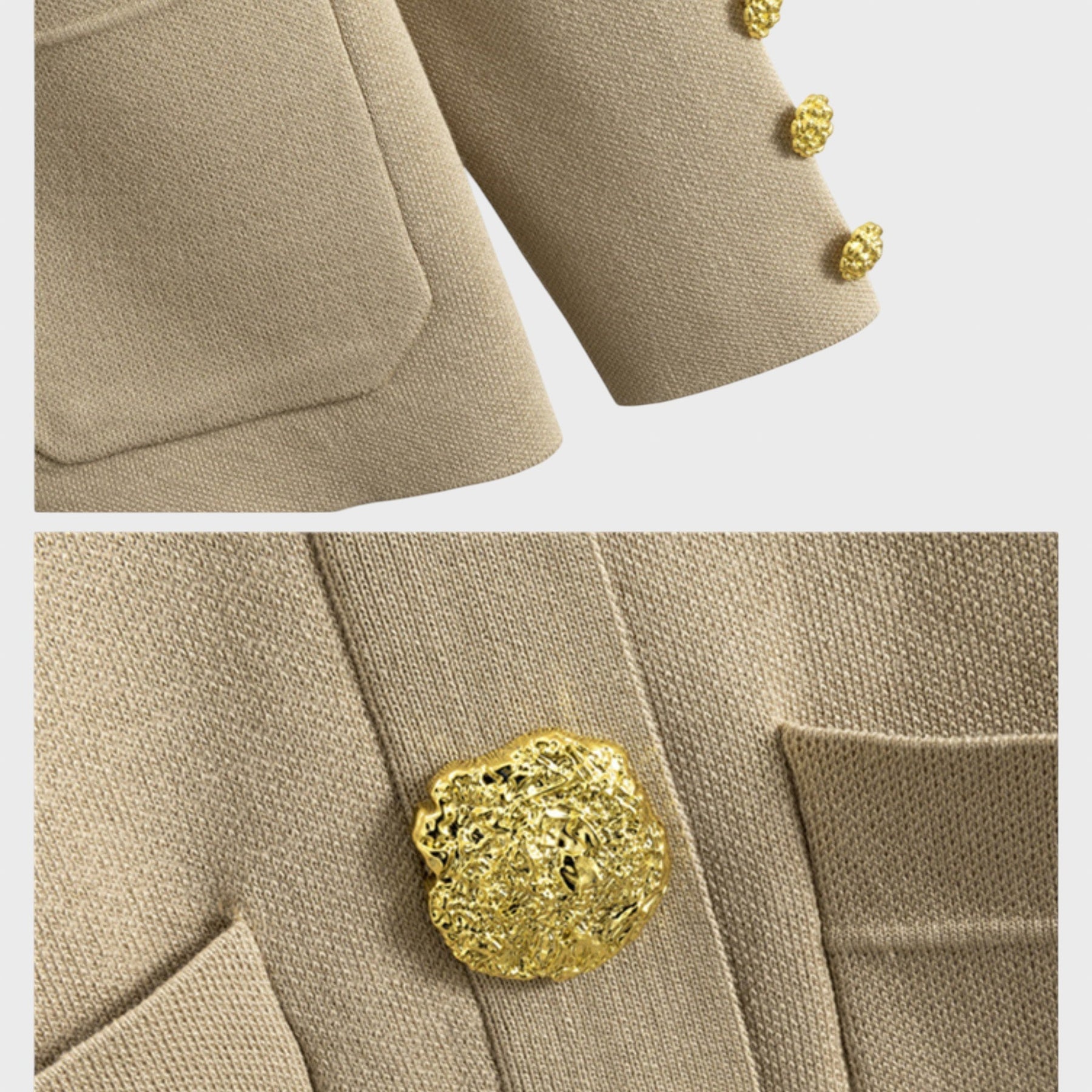 • Привличащи вниманието детайли: Палтото е украсено с големи текстурирани копчета в матово злато, които добавят нотка шик и изтънченост.