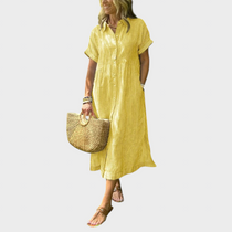 Елегантност без усилие – открийте роклята, която завладява от първия поглед! Тази лека и въздушна рокля е перфектната комбинация от удобство и стил, идеална за всякакви поводи – от разходки по крайбрежието до неформални кафета с приятели или романтични вечери. Нейният свободен силует и естествени материали осигуряват свобода на движението, докато дискретните детайли придават изтънченост на вашия вид.