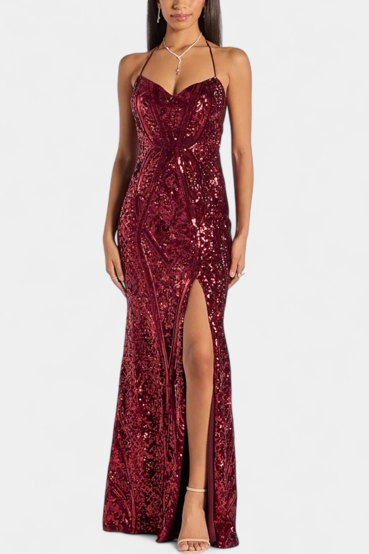 Тази очарователна рокля с халтер дизайн е създадена, за да подчертае вашата фигура и да ви накара да се чувствате уверени и привлекателни. Блестящите пайети улавят светлината с всеки ваш жест, осигурявайки ви внимание и възхищение на всяко събитие.