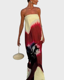 • Силует тип „бандо“: Дизайнът без презрамки подчертава раменете и ключицата, осигурявайки изчистена, елегантна линия. Дългата, ефирна кройка предлага максимална свобода на движение.