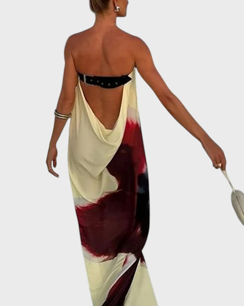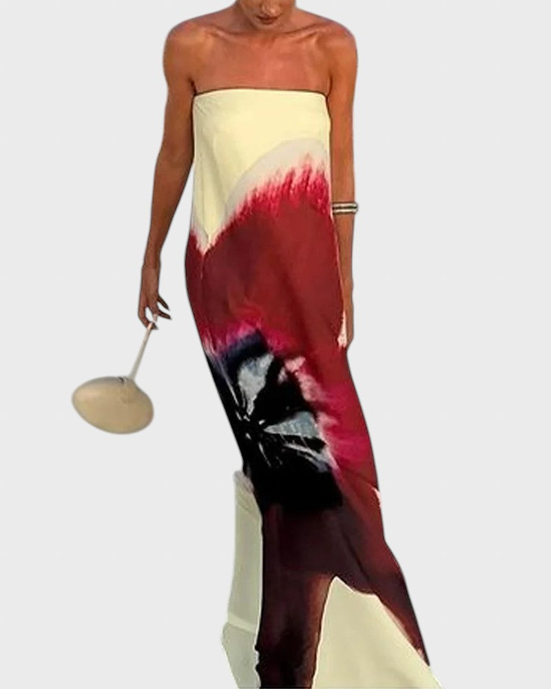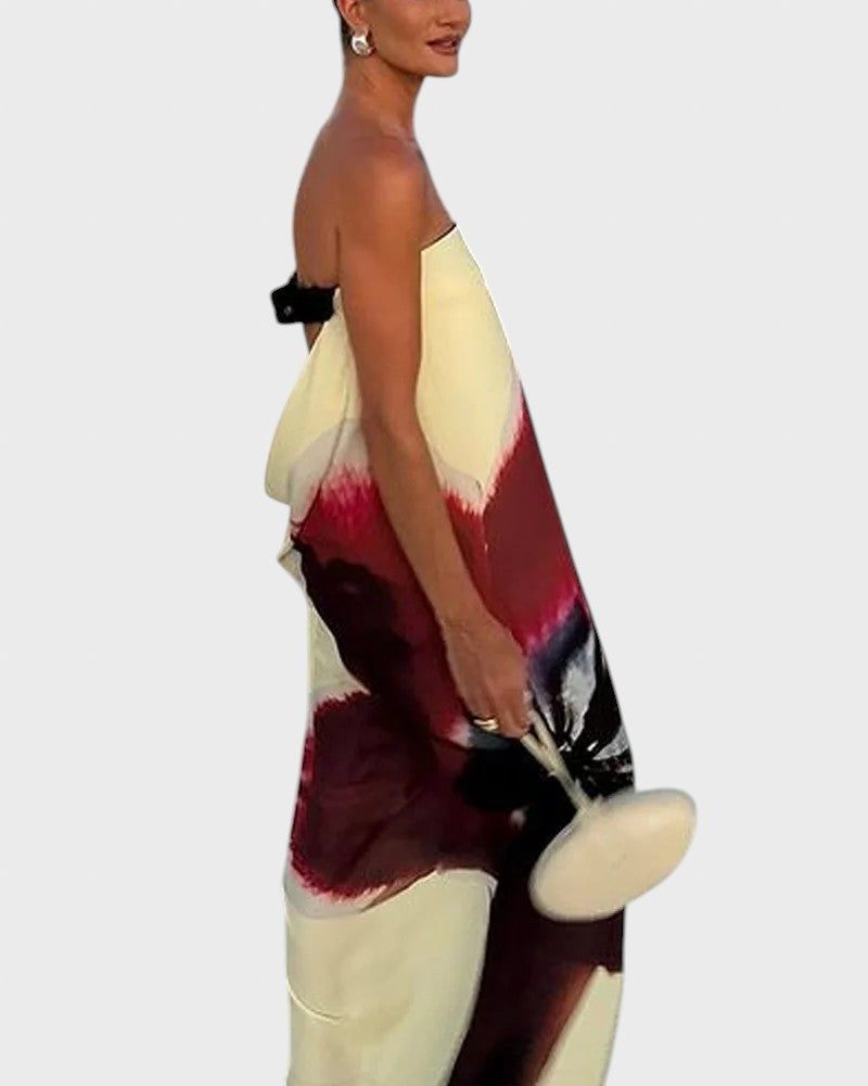 • Впечатляващ абстрактен принт: Принтът е сърцето на тази рокля, с големи, плавни щрихи, които извикват усещане за модерно изкуство и страст. Тази визия привлича погледите и ви гарантира, че сте център на вниманието.