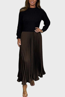 Съчетайте комфорт, елегантност и гъвкавост с нашата уникална рокля! Тази рокля комбинира блуза с дълъг ръкав и плисиран подгъв, предлагайки безупречно издигане на стила ви. Тя е сезонна незаменимост, която съчетава ежедневния стил с изтънченост, подходяща за всички типове тяло и всеки повод.