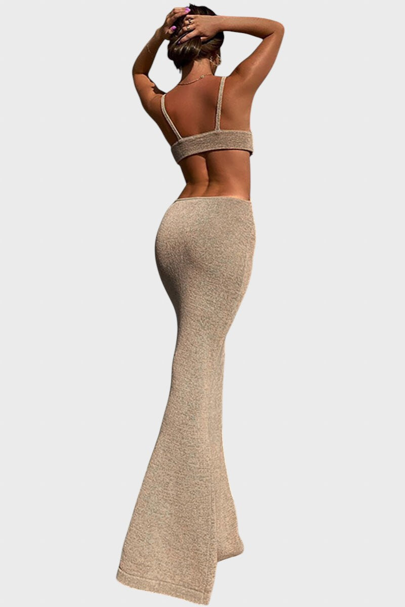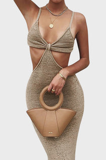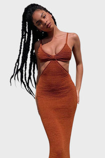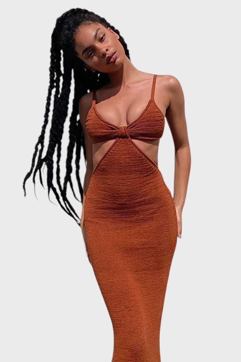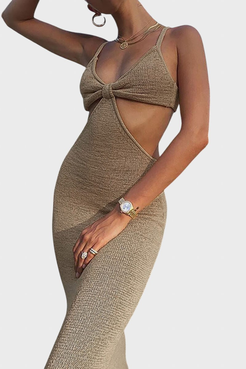 Чувствайте се като богиня, където и да отидете! С нашата смела миди рокля, съчетаваща уютната текстура на плетиво с чувствен дизайн, ще привлечете погледите навсякъде. Тази рокля не само, че е шик и секси, но и с изрези на талията, които подчертават вашата фигура.