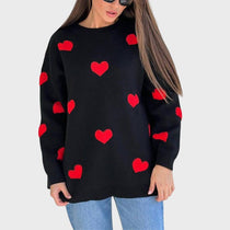 Добавете нотка чар и радост към гардероба си с този плетен пуловер, украсен с ярки червени сърца. Тази дреха е перфектната комбинация от забавление, непринуден стил и максимален комфорт, идеална за изразяване на вашата индивидуалност в по-студените дни.